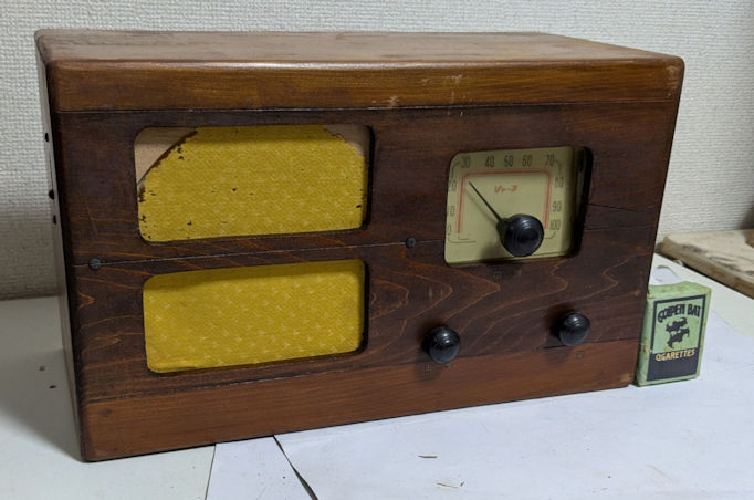 左上の局型123号と同じもののほかに、スリットが大きなものと、縦型のものが確認されている。裏蓋の止めねじは本来3か所だが、1か所しか止められた形跡がないものもある。キャビネットを含め、局型と同じ形のものが古いというわけでもないようである。裏蓋の板厚も2種類あり、キャビネットの樹種も塗装も一定していない。とにかくありあわせの材料で製造したということだったようである。左上のセットには、ラベルが貼られた形跡がない。闇ルートに回った品物という可能性も考えられる。