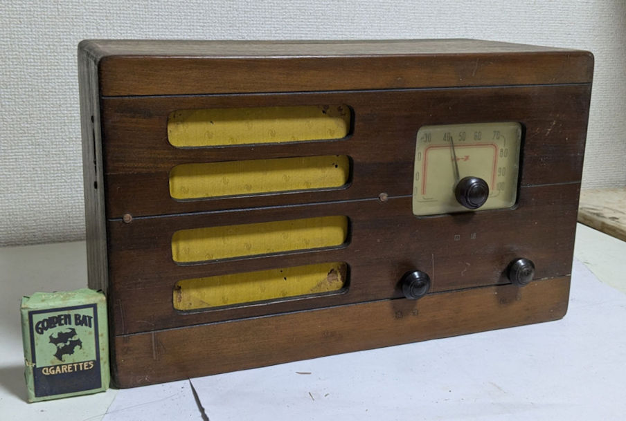 左上の局型123号と同じもののほかに、スリットが大きなものと、縦型のものが確認されている。裏蓋の止めねじは本来3か所だが、1か所しか止められた形跡がないものもある。キャビネットを含め、局型と同じ形のものが古いというわけでもないようである。裏蓋の板厚も2種類あり、キャビネットの樹種も塗装も一定していない。とにかくありあわせの材料で製造したということだったようである。左上のセットには、ラベルが貼られた形跡がない。闇ルートに回った品物という可能性も考えられる。