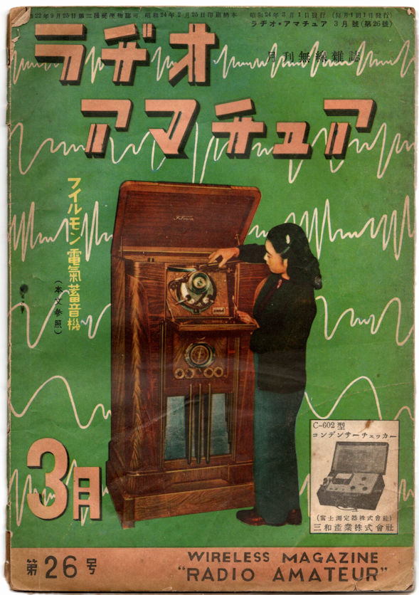 この表紙写真は、最上級の10球スーパー付きグランド型のFER-80型である。外観は戦前のカタログに掲載されているものと変わらない。フィルモンの再生部が搭載される分だけ、普通の電蓄より背が高くなるうえに、置き台に乗っているので、小柄な女性にはアーム操作が辛そうである。女性の服装から、写真はこの雑誌のために戦後撮影されたものだろう。この記事は再建を目指した宣伝の一環と思われるが、この表紙を含めて記事中の写真はすべて戦前の工場および製品の写真で、戦後の新しい製品の存在を示すものはない。
