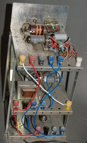 シャーシは木製から鉄製に変更されている。手前のビニールパイプは、90度回転させると、本体を垂直に立てて使うときの脚となる。5インチのマグネチック・スピーカが付属しているが、これはオシロで増幅作用を観測するときのマイクとしても使用する。理科教育振興法による認定章が表示されていて、中学校か高校の理科/物理の授業で使用されたものと思われる。このような実験器具は、工業高校など、工作設備や実験担当の専門職員が揃っている学校では汎用のシャーシを使って手作りされることも多かった。