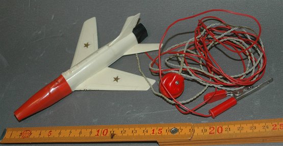 中小メーカが製作した飛行機の形をしたゲルマラジオ。受信するときは立てて使う。機体裏側の飛行機の車輪に相当する部分がダイヤルとなっている。わに口クリップの先端にプラグの刃が付いたリードが出ていて、これをコンセントの片側に挿して電灯線アンテナとして使う。現代ではとても許されない危険な構造である。同社は、このほかにロケット型、ペンシル型、こけし型等、さまざまなユニークな形状のゲルマラジオを発売していた。価格は1,500円から2,000円くらいで、当時としては高価な玩具である。