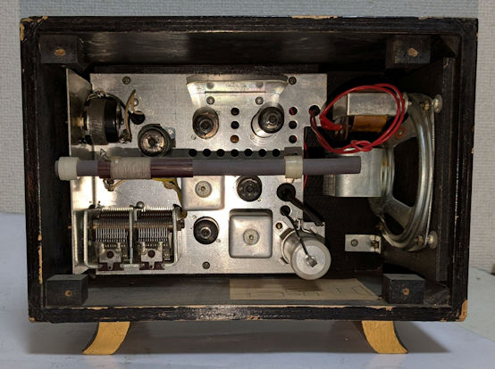 ヨーロッパ風のデザインが特徴の小型5球スーパー。バーアンテナを使っている。部品の小型化が十分進んでいないことがわかる。