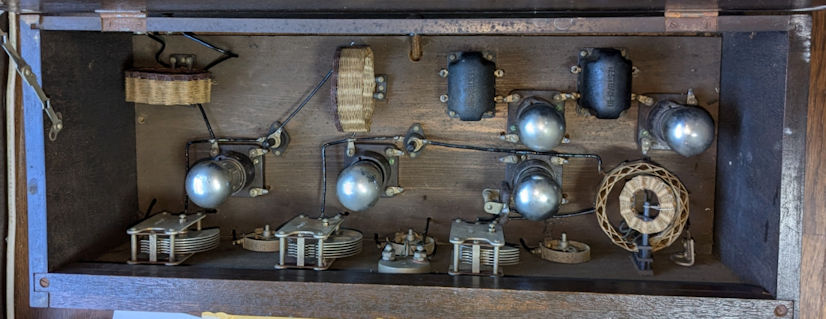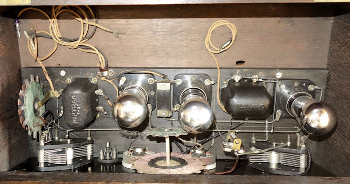 多くのこの時代のラジオ同様、このセットにも改造の跡が見られる。再生の効き方を改善するためか、パネルの中央右寄りにミゼットバリコンが追加されている。ツマミと部品の形状から、この改造は1930年代前半に行われたと思われる。中央下部のツマミは両方ともレオスタットだが、左側はツマミが失われ、ターミナル用のツマミで代用されている。中央奥に、C電池用の手製のターミナルがあり、外からリード線を接続するようになっているが、現在はショートされている。B電池のタップでバイアスをかける方式に変更されたものと思われる。