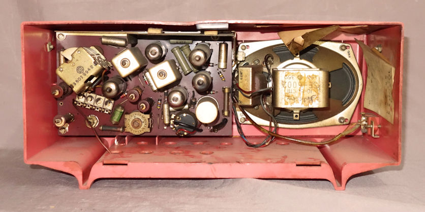 この頃、ステレオの流行によってモノラルのラジオやテレビにも2スピーカのモデルが流行した。このセットは、一見2スピーカ式のように見えるが、実はスピーカは片側にしかない。カタログには「ステレオスタイル」とある。コストダウンのためであろうが、商道徳という点でいかがなものだろうか。キャビネットを裏から見ると、片側のスピーカの取りつけねじの位置に、取りつけボスの跡らしき形状が見られる。本来は2スピーカ式として設計されたもののように思われる。シャーシは、整流管がACコードと反対側の、バリコンのすぐ横にあるという奇妙な配置となっている。